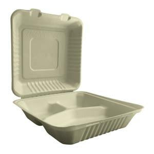 8"x8"x3" PFAS FREE ECO BIODEGRADABLE BAGASSE 3 COMPARTMENT HINGED CONTAINERS - 200CT