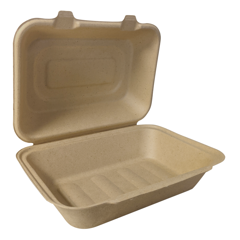 Use our 9"x6"x3" (PFAS Free) Eco Biodegradable Compostable Fiber Hinged Containers to serve meals sustainably. These natural fiber containers are solid, biodegradable, and compostable alternatives to plastic or foam. These hinged-lid containers are ideal for takeaway, catering and food service. They provide environmentally friendly, durable food packaging without PFAS or other dangerous chemicals.